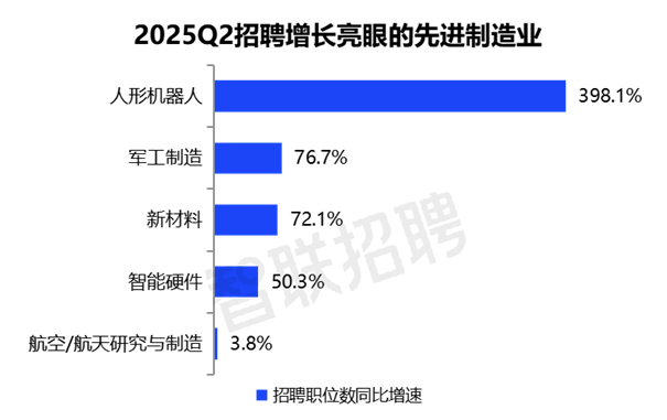 数据显示,今年二季度人形机器人领域招聘职位数同比增长398.1%,增速遥遥领先。这反映出人工智能与机器人技术深度融合的趋势,随着智能化转型加速,相关研发、制造、应用端人才需求呈现井喷式增长,成为产业创新的核心驱动力。
